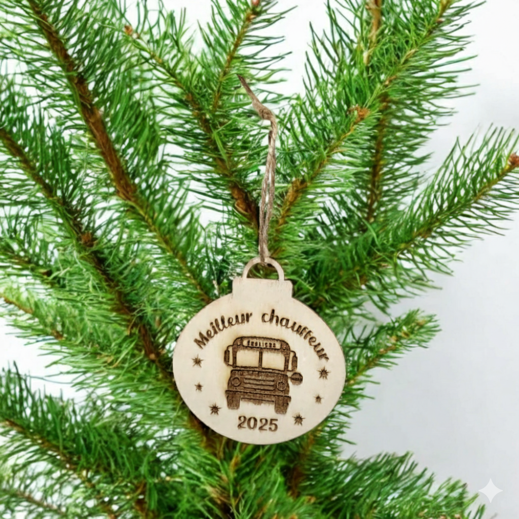 Ornement Boule de Noël en Bois Gravé - "Meilleur Chauffeur 2025" avec Autobus Écolier